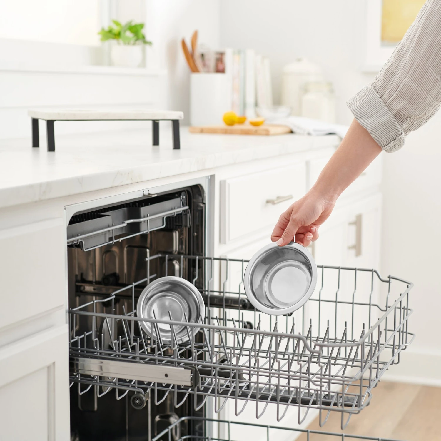 - Care instructions: Removable stainless-steel bowls are hand washable and dishwasher safe.
